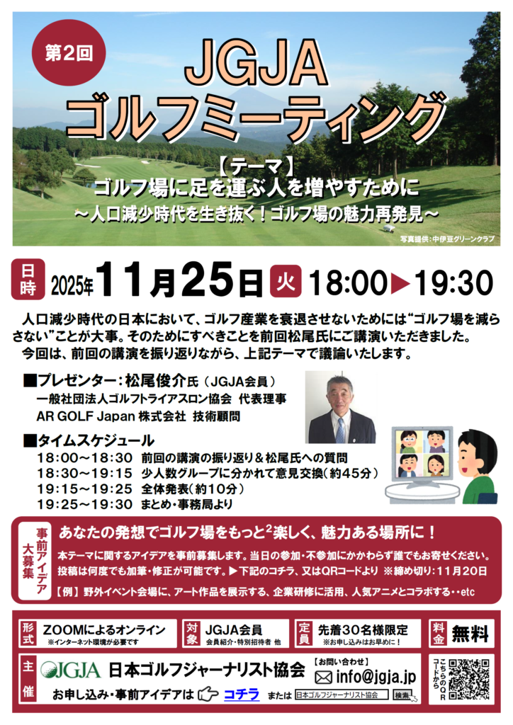 その第2回JGJAゴルフミーティングが、来る11月25日(火)18時より、ZOOMによるオンラインで開催いたします。今回は前回のゴルフミーティング(9月9日開催、レポートはこちら)の続編で、テーマは「ゴルフ場に足を運ぶ人を増やすために」です。